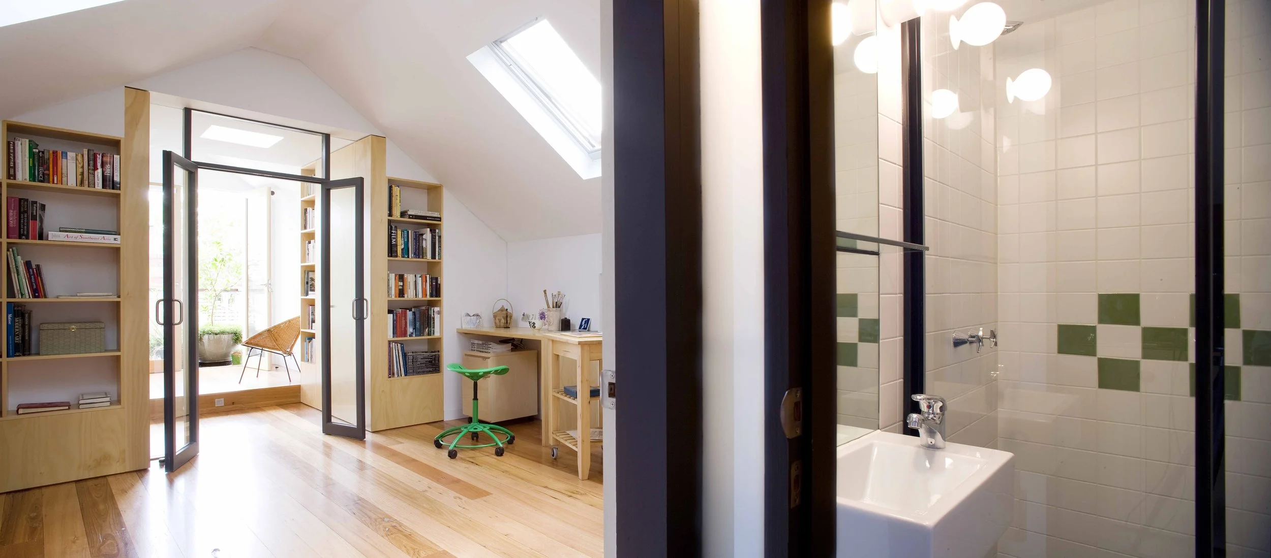 They envisaged independent home offices, sleeping quarters for visiting grandchildren and a painting studio with wash-up area and small bathroom—all within the existing roof. At this point they were unsure whether all this would fit and how the attic would be accessed. Through careful design, we managed to fit their entire wishlist and additional walk-in storage and a north-facing balcony. A small downstairs bedroom was sacrificed to become a second study and the stairwell. The build took place in 2008.